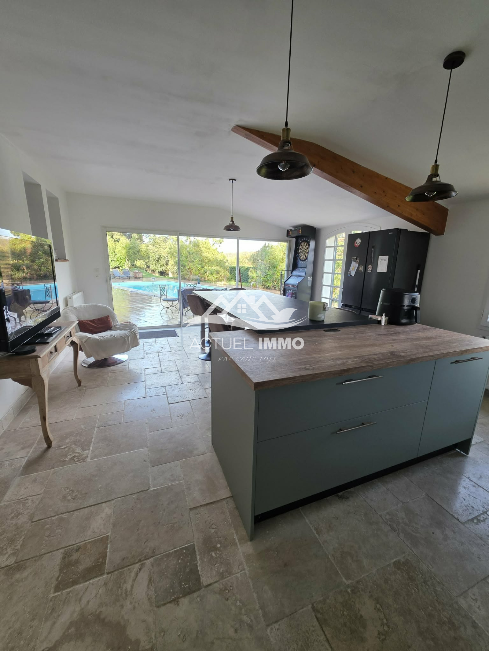 Grande cuisine équipée aménagée donnant sur la piscine