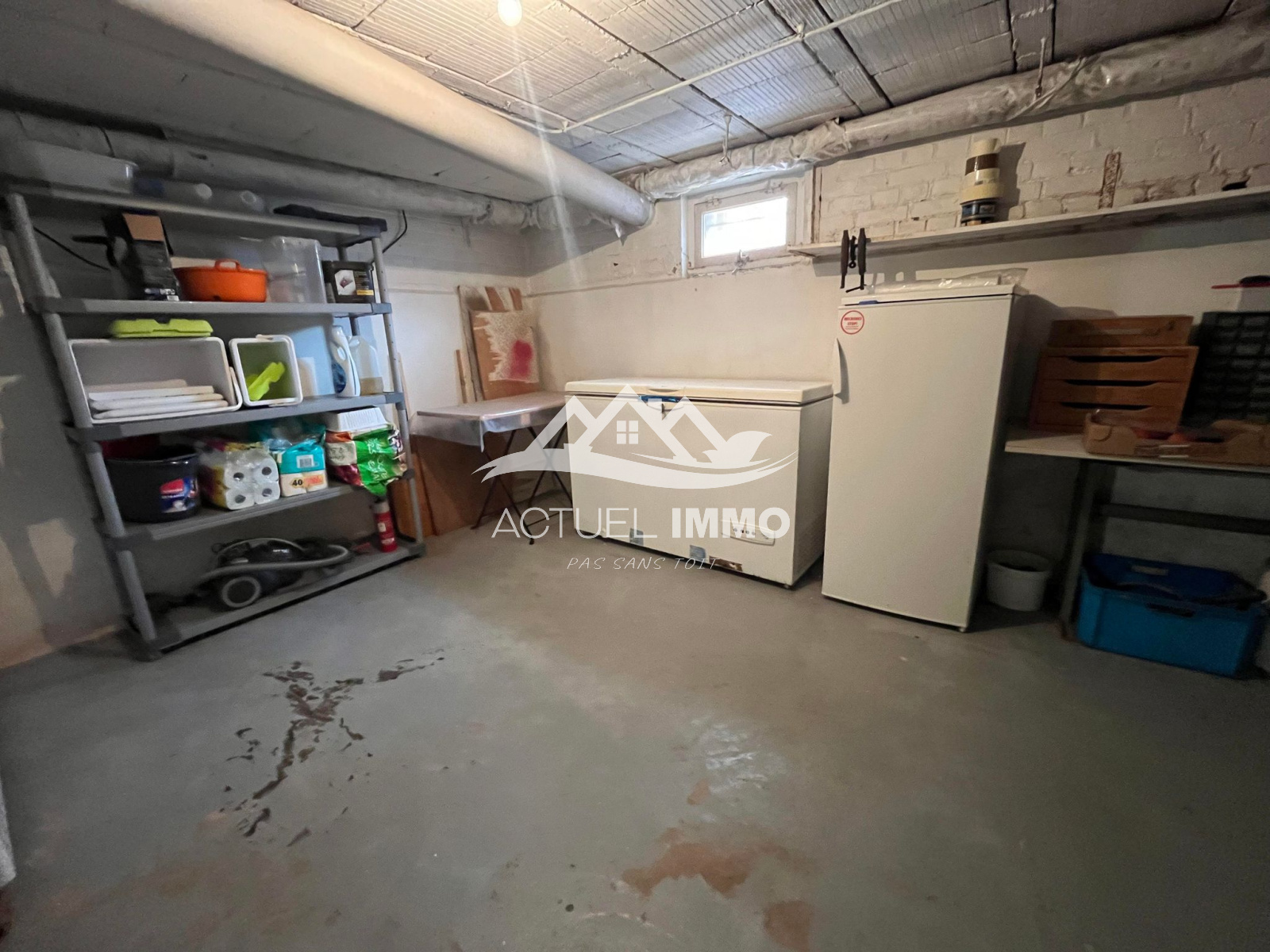 La cave de 50 m² est pratique pour la chaudière au gaz de ville et tous vos rangements nécessaires, avec accès au vide-sanitaire relié au tout-à-l'égout.